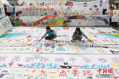 中午12点活动正式拉开帷幕,操场跑道上三路排开,22个班级的同学各自在8米长的画布上同时作画,远远望去甚是壮观。经过前期的精心构思和设计,同学们一个个拿着作画的笔刷,手绘“防诈骗”主题的简笔动漫图、流行语,描红摹绿,挥洒自如。画布上“诈骗的小船说翻就翻”,“千里之外不见面,提防网络把你骗”,“招聘广告莫轻信,天上不会掉馅饼”等或萌或朗朗上口过目不忘的语句,配上五彩颜色,特别吸引眼球。