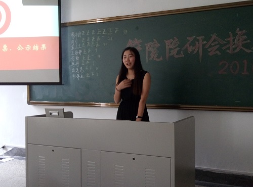 在蒋丹同学的主持下,新一届研会主席团换届选举开始。竞选同学依次上台展示自己,讲述自身特点、社团经历、竞选理念,以及对于研会今后的展望。经过公开唱票,最终蒋沛诗同学以34票最高票获选研会主席,刘汀、袁兰兰获选研会副主席。王海静、何畅、周婷、项慧慧、谢锦亚、曾玲同学获选研会部长。