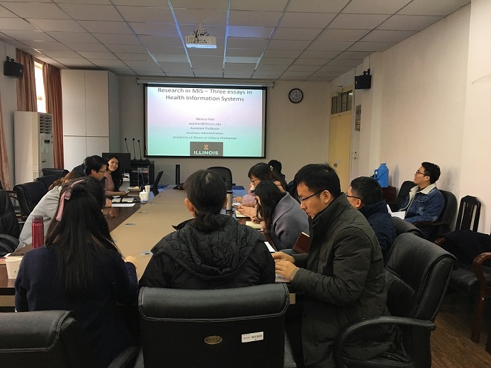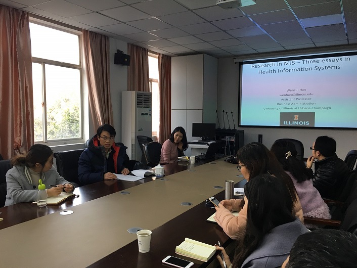 2017年12月19日,公司杰出员工、美国伊利诺伊州立大学香槟分校助理教授韩文萃博士应邀至公司为师生作题为“Three Essay in Health Information Systems Research”的讲座。讲座由经理助理周晓剑副教授主持,管院相关研究领域教师和员工参加了此次会议。