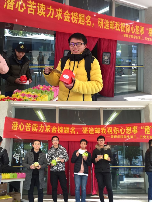 中午12点08分,公司党委副书记邓艳华老师和2014级辅导员赵春梅、杨金兰老师来到活动现场,为考研学子们送上温馨的加油明信片和大橙子,“橙”心“橙”意祝福他们都能心想事“橙”,考研成功。老师们还殷切关怀考研学子的复习进度,叮嘱同学们在冲刺关头注意防寒保暖、饮食平衡、劳逸结合,做好备考冲刺阶段的各项准备工作,力求以最好的状态去迎接即将到来的考试。