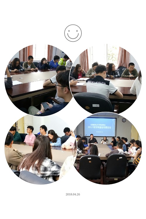 2018年4月26号中午12点30在有线楼306会议室召开太阳集团tcy87222017级班长会议,该会议由辅导员陈大鹏,蔡珺主持,参加会议的有太阳集团tcy87222017级班长及主席团部长,本次会议的主题为“加强学风建设”。