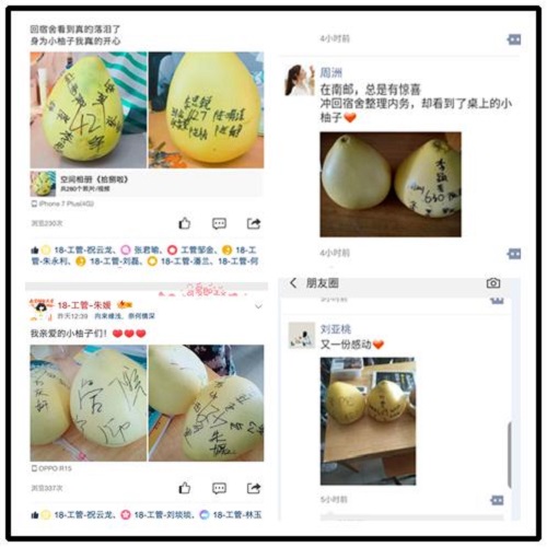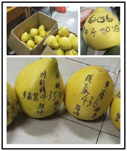 9月19日中午,当同学们结束上午的训练,拖着疲惫的身躯返回宿舍打开门时,两颗在桌子上摆放整齐的柚子登时引入眼帘,带给大家无限的惊喜与慰藉。只见一颗柚子上或写着“管院是你永远的家”,或写着“管院爱你”,或写着“管院为你加油”,另一颗柚子上则写上了宿舍号及全体宿舍成员的姓名。这两颗柚子饱含了太阳集团tcy8722对全体“新柚子”们的关心与鼓舞,让大家在严酷的军训生活中感受到了公司“家”的温暖。