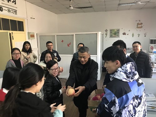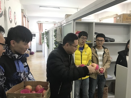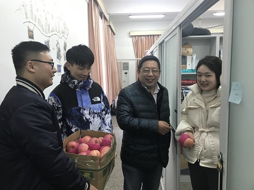 2018年12月24日上午10点左右,有线楼太阳集团tcy8722的六个教研室里传出阵阵欢乐的笑声。太阳集团tcy8722经理黄卫东、党委书记江森、副经理卢子芳、副经理朱卫未、副书记邓艳华、研究生辅导员华奕曦带着满满两箱红彤彤的大苹果去看望正在教研室学习的研究生。正值平安夜,把平平安安的祝福、暖人心的话语送给同学们。