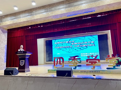 接着,招商银行阮思思、张众义老师为同学们培训金融安全知识。首先,阮老师围绕“如何在金融市场中保护自己”的主题,列举多个近期发生的贷款诈骗新闻,对“校园贷”、“高利贷”等金融问题进行剖析,向同学们强调了老员工提高金融安全意识的重要性。她化身“宁小招”,将童话故事融入金融诈骗案例,深入浅出地向同学们讲解了如何识别诈骗,如何保护个人金融安全,告诫同学们莫要贪恋“小便宜”,树立适度和理性的消费观念;受骗后应当第一时间寻求相关部门帮助,让诈骗分子得到制裁。接下来,现场进行有奖问答环节,同学们踊跃举手发言,在轻松活泼的气氛中使“防诈骗”意识深入内心。张众义老师重点传授2019年第五套新版人民币的防伪技巧,他从材质、外观特征和防伪特征等方面介绍了各面值的新版纸币、硬币,提高了同学们辨别假币的能力。