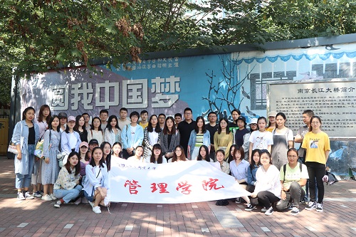 此次参观学习活动分为三部分。大家在大桥入口处集合后,由研三工商管理专业蔡特金同学为大家讲解大桥的建成与发展,特别是大桥对于南京、对于江苏以及对于中国的重大意义。然后是有奖竞答环节,蔡特金同学出题,其余同学举手回答,答对的同学都会得到精美礼品,大家都踊跃参与。最后所有同学陆续上桥,走了十几分钟引桥后便到了被列为“金陵四十八景”之一的大桥标志性建筑——桥头堡,桥头堡上高70米的三面红旗大型建筑气势雄伟,大家纷纷合影留念。走在桥上,每一步都能感受到历史的厚重感和革命前辈们艰苦奋斗、自强不息的精气神。站在桥上,可一览祖国壮丽山河!活动结束后所有同学都有序下桥。