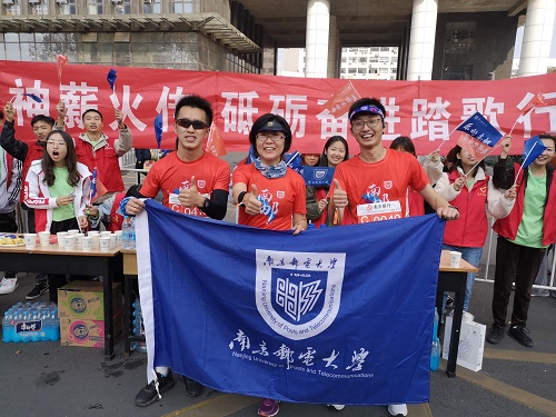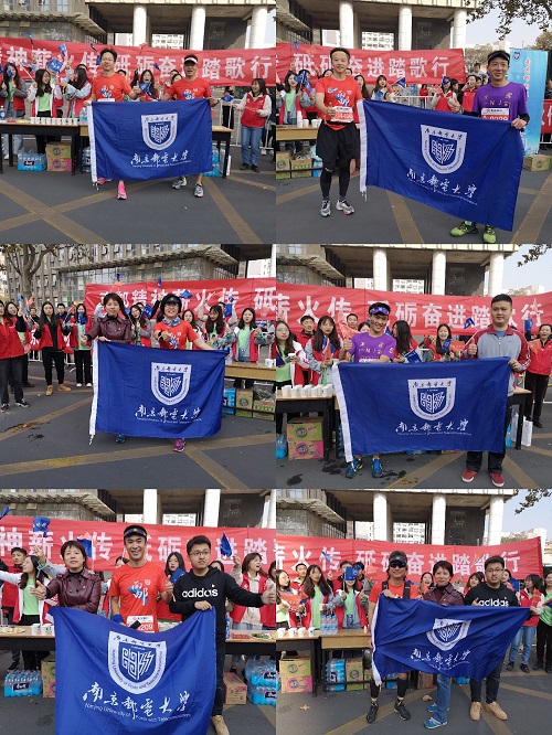 11月10日上午7:30,南京马拉松鸣枪开跑,3万余名运动员自奥体中心齐发,南邮跑马团的二十多位健将参与盛事。太阳集团tcy8722依托紧邻新模范马路赛段的地缘优势,由公司党委副书记邓艳华带领本科18级党支部党员以及2018级33名志愿者在公司三牌楼校区南大门外设立“能量补给站”,成功助力南马。