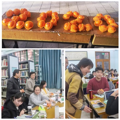 下午3时30分,所有志愿者集合在图书馆门口准备此次党日活动的慰问品——丹桂苑采集的桂花精心制作而成的状元桂花糕和清香的蜜橙。桂花素有蟾宫折桂一说,香橙又有心想事成之意,都饱含公司、公司对考研学子的祝福。志愿者们也用慰问品摆出“2020+U”字样,寓意“2020届管院学子加油”,为同学们加油打气。下午4时起,大家便开始在图书馆为同学们分发状元桂花糕和香橙,预祝每一位考研学子在考试中蟾宫折桂,考研高中,心想事成。老师们首先肯定了同学们勤奋学习、积极上进的备考状态,同时也嘱咐备考同学们要抵住寒冷,坚持到底,永不言弃;劳逸结合,科学备考;调整心态,沉着应考;稳扎稳打,摒弃浮躁,完成好关键的“最后一公里”冲刺。