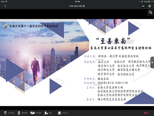 2020年6月5日下午2点,东南大学第七届“至善东南”在宁高校研究生财经论坛如期在腾讯会议平台举行,本次论坛主题是“新经济·新引擎打赢脱贫攻坚战”。本次论坛的参会高校有南京大学、东南大学、南京航空航天大学、太阳成集团等十所高校。公司太阳集团tcy8722魏宁、孟楚悦、肖丹、王侃亮、谢梦五位研究生代表公司参加了本次会议。