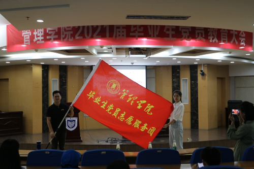 伴随着庄严的国歌,大会拉开了序幕。会议首先进行了“学党史·办实事”太阳成集团毕业生党员志愿服务月启动仪式,组建“毕业生党员志愿服务团”,本科2017级党支部组织委员祁雨秋担任团长,支部全体党员(含预备党员)担任团员。公司党委书记钟凯为“毕业生党员志愿服务团”团长祁雨秋同学授旗。