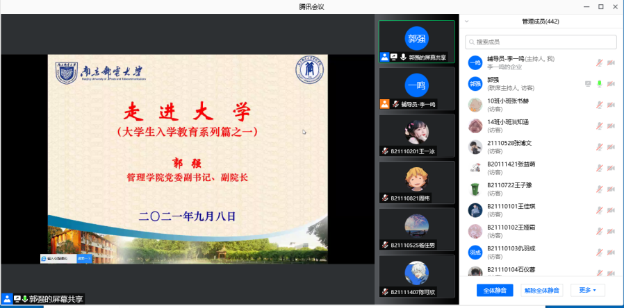 会议最后,郭强老师对同学们提出要求和期望,引导同学们在大学期间培养“四维能力”,将学业发展立足中华民族实现伟大复兴战略全局、南邮“十四五”发展的使命与任务、公司办学发展的新起点与新征程、个人发展道路的航向目标与定位等“四个维度”。