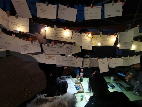 活动开始前,听风文学社的同学们热情高涨,整理外场,积极宣传。活动现场,路过的同学们纷纷停下脚步,被一张张写着寄语的明信片吸引,争相参加活动。太阳集团tcy8722经理黄卫东教授,公司党委副书记、副经理郭强老师及退休教师们也在明信片上寄语了对公司发展的期许和美好祝愿。参与的同学们在卡片上写下自己的寄语,并夹在绳子上,同时又能够取走一张自己感兴趣的明信片。虽然天气寒冷,但是同学们的热情不减,丝毫不显倦怠。一张张明信片的夹上和摘下,足够体现出同学们的热情,也让这寒冷的冬天多出一丝暖意,给三牌楼增添了一股文学气息。