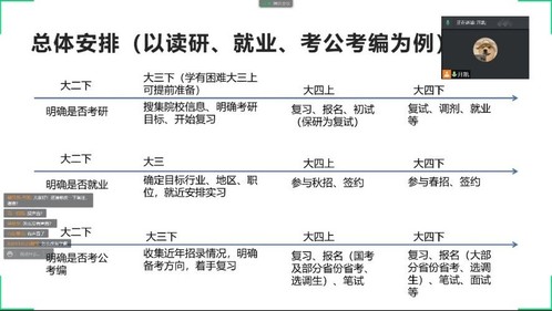 随后开凯老师详细介绍了升学、留学、求职、考公考编、参军、创业等大家毕业后的主要去向,并重点介绍了各个方向的主要要求、优缺点、需要注意的问题等,并分别以升学、求职、考公考编等三个主要的去向为例向全体同学介绍在大学期间如何准备按时间点做好相关准备。除此之外,还摘录了公司近年就业质量报告的有关内容及回答部分员工和家长的问题,帮助广大同学更好的明晰目标,精准定位。开凯老师希望全体同学利用寒假多方面搜集信息,尽早明确自己的方向,做到有的放矢,精准发力。