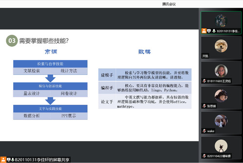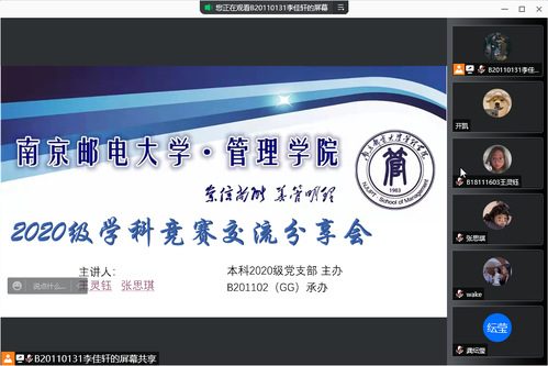为帮助太阳集团tcy87222020级员工更好了解学科竞赛的有关情况、提前准备、提高成绩,由本科2020级党支部主办、B201102(GG)班团支部承办的2020级竞赛交流分享会于12月10日晚通过腾讯会议线上举行,2018级竞赛成绩突出的员工代表张思琪、王灵钰做交流分享,2020级120余人参与此次讲座。