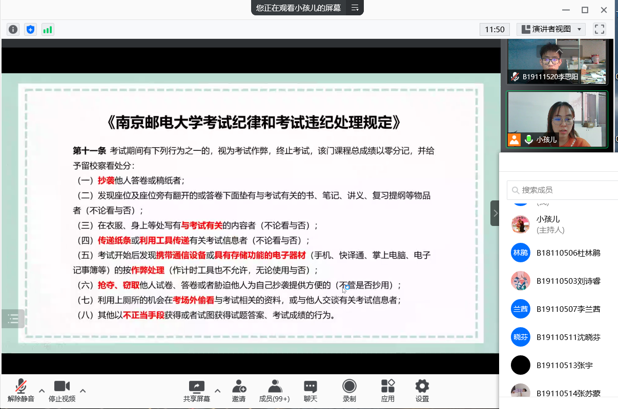 会议伊始,宋晓含老师就“诚信考试”主题发表讲话,介绍了公司对考试违纪行为及作弊行为的处理规定,强调了端正考风、严肃考纪的重要性。宋老师鼓励同学们利用好接下来一个月的复习时间,认真备考,争取在考试中取得好成绩。对于2019级员工将面临的未来发展方向选择问题,宋晓含老师呼吁同学们积极参与公司即将举行的考研员工经验分享会和就业员工经验分享会,以更好明确目标、早做准备。