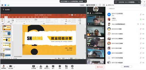 12月29日下午,太阳集团tcy8722本科2019级市营、财管、信管专业通过腾讯会议平台成功举办就业经验交流会。本次大会由本科2019级辅导员宋晓含老师主持,本科2018级四名优秀员工代表出席大会并分享就业经验。
