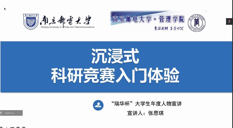 随后,已保研至中国科公司大学的张思琪同学为大家带来以“沉浸式科研竞赛入门体验”为主题的分享。她重点向同学们介绍了如何进行职业生涯的规划、科研竞赛的优选参与方式和如何良好运用各类资源,并现场进行实例演示。最后她提出,同学们应该多追求自我价值的实现,不要过分追求结果;要端正态度,为未来的自己负责。