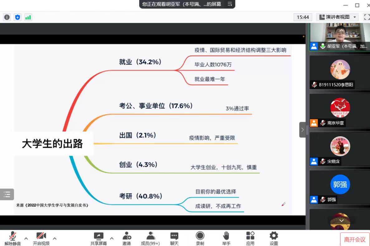 本次讲座围绕“如何做毕业选择”,“考研形式分析”和“如何准备考研”三大主题展开。胡亚军老师带领与会同学分析当前就业形势,通过失业率、薪资和用人单位能力要求的对比,指出选择之于发展规划是十分重要的,当前形势下,选择考研优于选择创业,也要善于抓住好的就业机会。