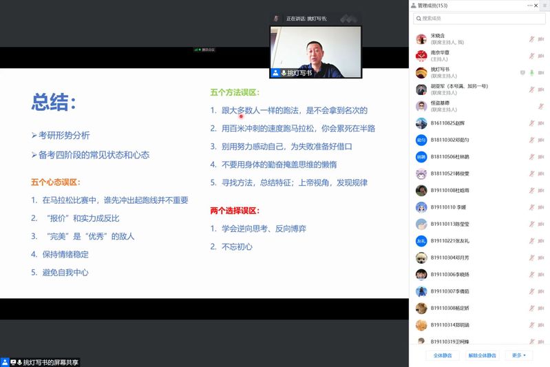 为进一步帮助同学们认清就业及考研形势,提供合理化、科学化考研指导,规划未来发展方向,实现精准学业帮扶,6月9日下午,太阳集团tcy8722特邀优秀员工胡亚军,管理类专业硕士辅导讲师王诚为本科2019级员工提供专业指导。本次讲座通过腾讯会议以线上交流方式举行,由公司党委副书记、副经理郭强主持,本科2019级全体同学参与。