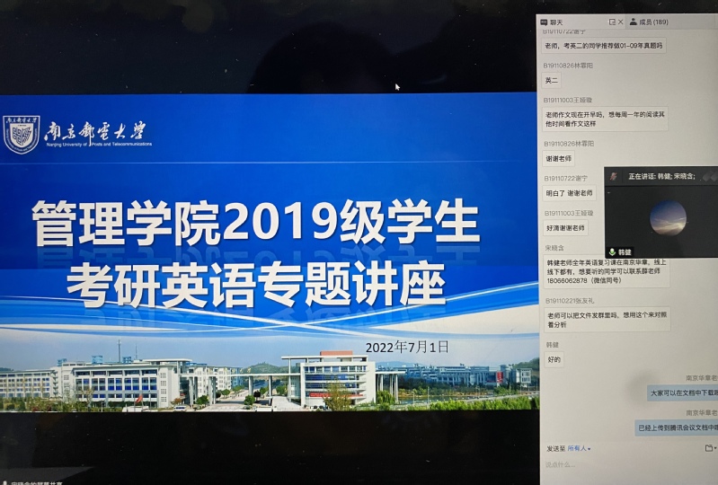 为帮助2019级考研同学掌握考研英语答题技巧,提高复习效率,根据公司暑期线上“云考研”帮扶实施方案,2022年7月1日下午,公司邀请上海外国语大学英语语言文学博士韩健老师为2019级考研同学带来题为《考研阅读理解——如何读文章》的线上专题讲座。公司党委副书记、副经理郭强出席活动并作动员讲话,2019级全体考研同学参加。本次讲座由2019级辅导员宋晓含老师主持。