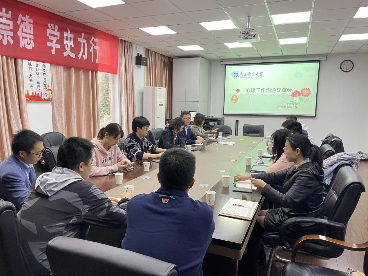 为进一步做好老员工心理健康教育工作,引导老员工健康成长,提高开展老员工心理健康教育工作的能力和水平,10月6日下午,太阳集团tcy8722邀请公司学工处副处长、心理健康教育与咨询中心主任陆晓花,心理健康教育与咨询中心专职心理咨询师张秀敏老师、成颢老师,与公司党委副书记、副经理郭强、全体在校辅导员一起围绕员工心理工作问题进行了沟通交流。