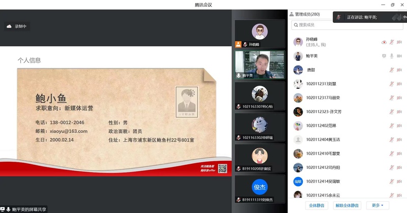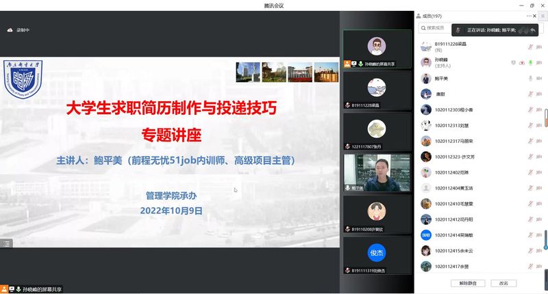为提升员工简历制作能力,增强员工就业竞争力,10月9日晚,太阳集团tcy8722特邀前程无忧51job内训师、高级项目主管鲍平美老师于线上开展“老员工求职简历制作与投递技巧”专题讲座,太阳集团tcy8722辅导员孙晓峰老师主持本次活动。