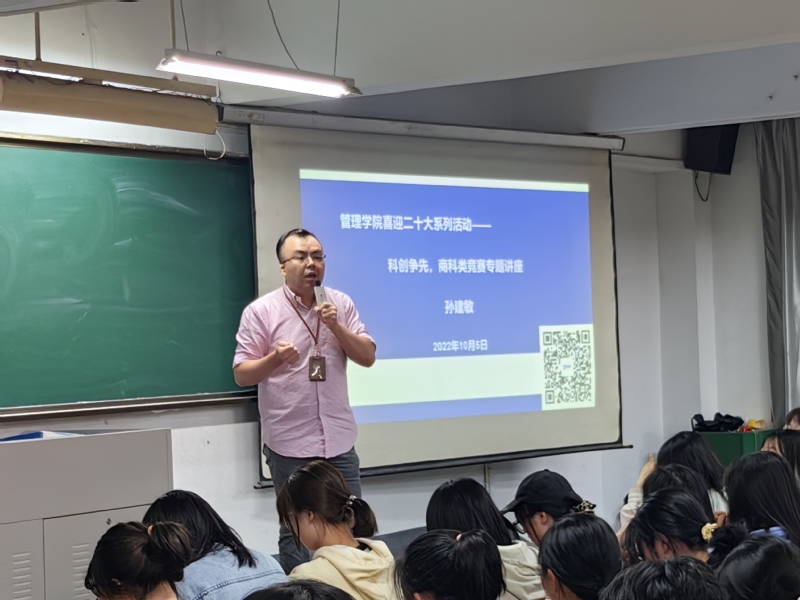 10月5日晚,太阳集团tcy8722在三牌楼校区无线楼举行“喜迎二十大系列活动”——科创争先,商科类竞赛专题讲座,特邀太阳成集团MBA中心孙建敏老师为同学们带来市场调研大赛、电子商务大赛等商科类竞赛的指导分享。公司各个年级200余名同学聆听了讲座。