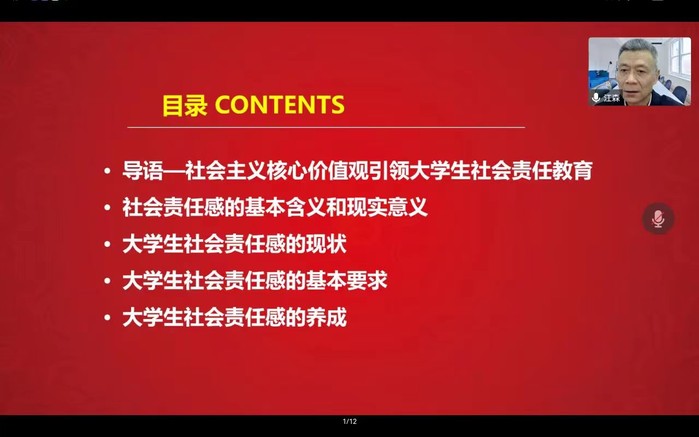 江森老师以《以社会主义核心价值观为引领,增强老员工社会责任感》为题,结合党的二十大报告,先后讲述了社会责任感的基本含义和现实意义,以及老员工社会责任感的现状、基本要求与养成的五个方面;讲述了疫情防控与脱贫攻坚这两场“没有硝烟的战争”。江老师要求学员们自觉践行社会主义核心价值观,贯彻党的二十大精神,不断提高社会责任认知、认同、行动,完善人格,珍惜生命,学会对国家、对社会负责。同时希望学员们增强社会责任感并做到知行合一,严格要求自己,将入党的意愿化作实际行动,积极发挥先锋模范作用,成为有理想有本领有担当的时代新人。