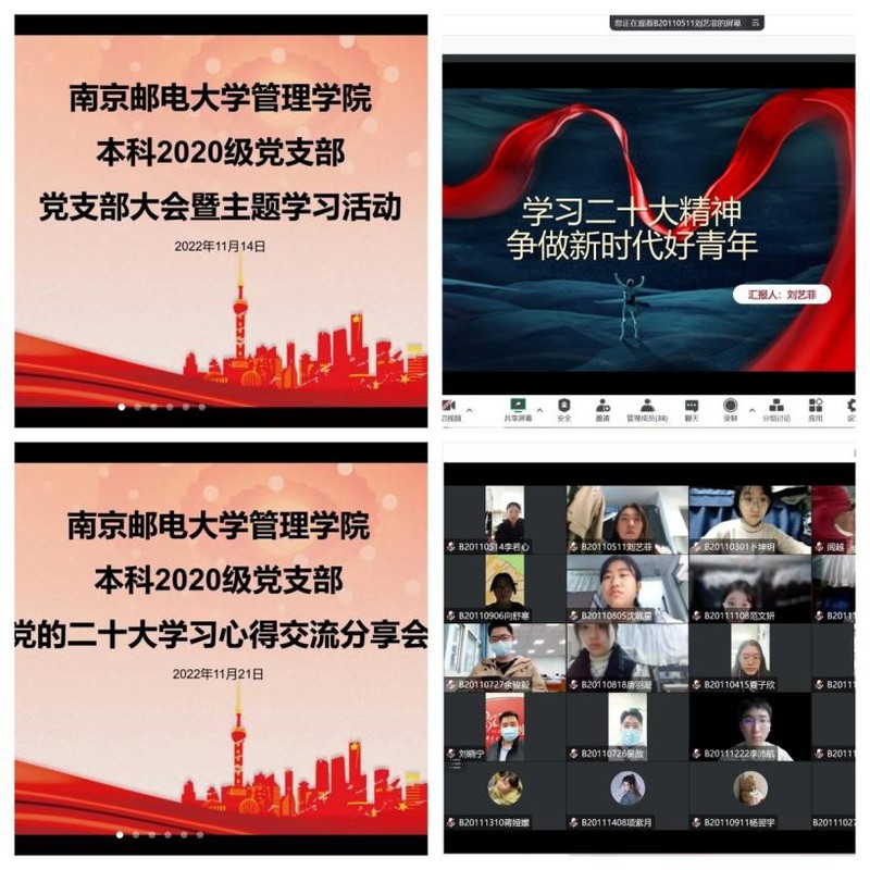 党支部还指导2020级各团支部开展二十大系列活动,各团支部通过员工党员讲党课等方式将党的二十大精神及时宣传至广大青年员工中,财管3班、人管9班等团支部还开展学习二十大知识问答,以知识问答的方式进一步巩固广大团员青年对二十大要点的理解和掌握。11月上旬,党支部指导各团支部积极参加“柚子青年·诵读学传”展示活动,人管7班团支部顺利入选,11月9日,该团支部代表公司全体本科生参加展演,以朗诵的形式发出青年声音、诠释青年担当。此外,党支部选报的员工党员姚瑶顺利入选校第四届优秀学子宣讲团,将代表支部在员工群体中深入开展党的二十大精神的朋辈宣传教育工作。
