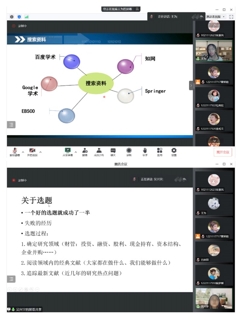王为老师主要围绕学术规范、文献搜索、确定选题、如何创新和实证方法等五个方面介绍。王老师强调,论文选题要紧紧围绕财务方向,学术理论要联系实际,论文题目要明确具体。此外,王老师为研究生们介绍了常用的中英文文献检索网站和获取渠道,并以具体文献为例介绍相关实证方法。