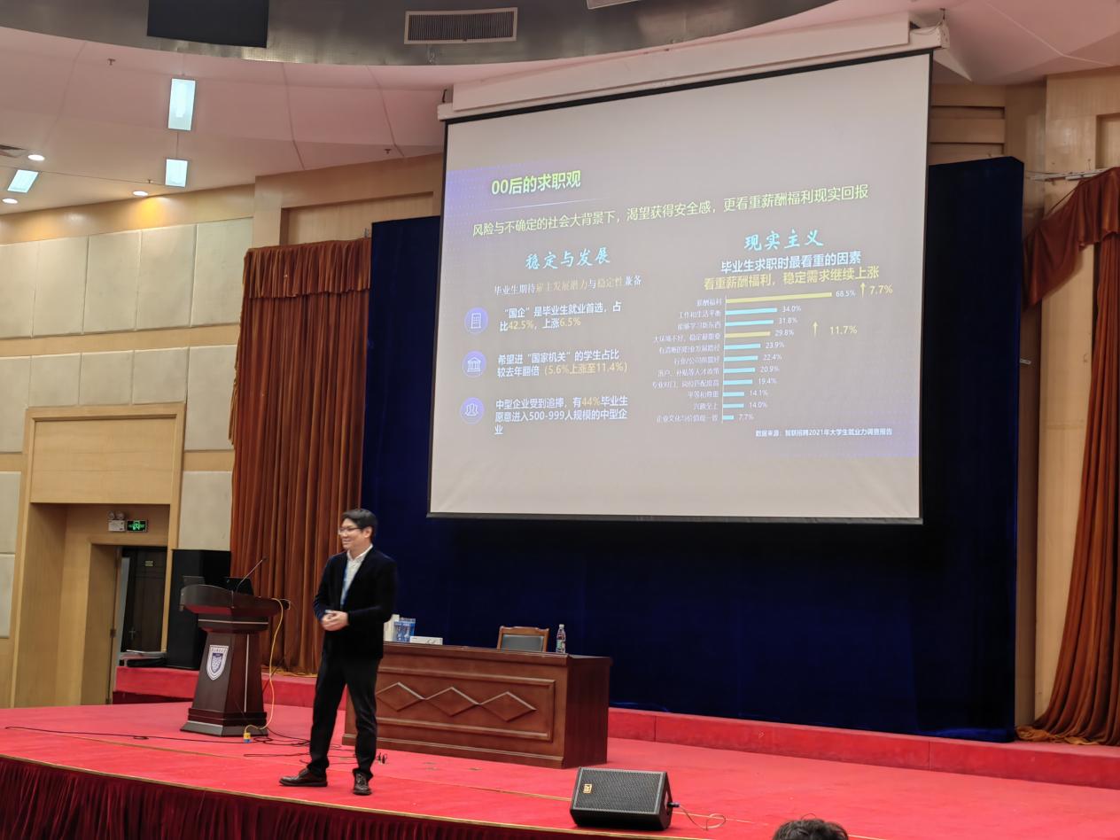 为深入学习党的二十大精神,贯彻落实“就业优先”战略部署,全面加强公司2024届毕业生就业指导,推动校企供需对接,帮助员工明确未来职业规划,提高员工就业竞争能力,4月24日下午,公司在三牌楼校区科学会堂二楼报告厅组织开展第六期高管大讲堂暨2023生涯活动月首场报告会,邀请中兴通讯华东区招聘总监赵启杭进行专场报告,就职于中兴通信的公司员工姜知非、施泽锋陪同出席活动。活动由太阳集团tcy87222020级辅导员开凯主持,2024届毕业生、辅导员代表等200余人现场聆听报告。