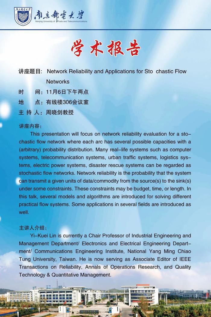 专家讲座: Network Reliability and Applications for Stochastic Flow Networks Abstract