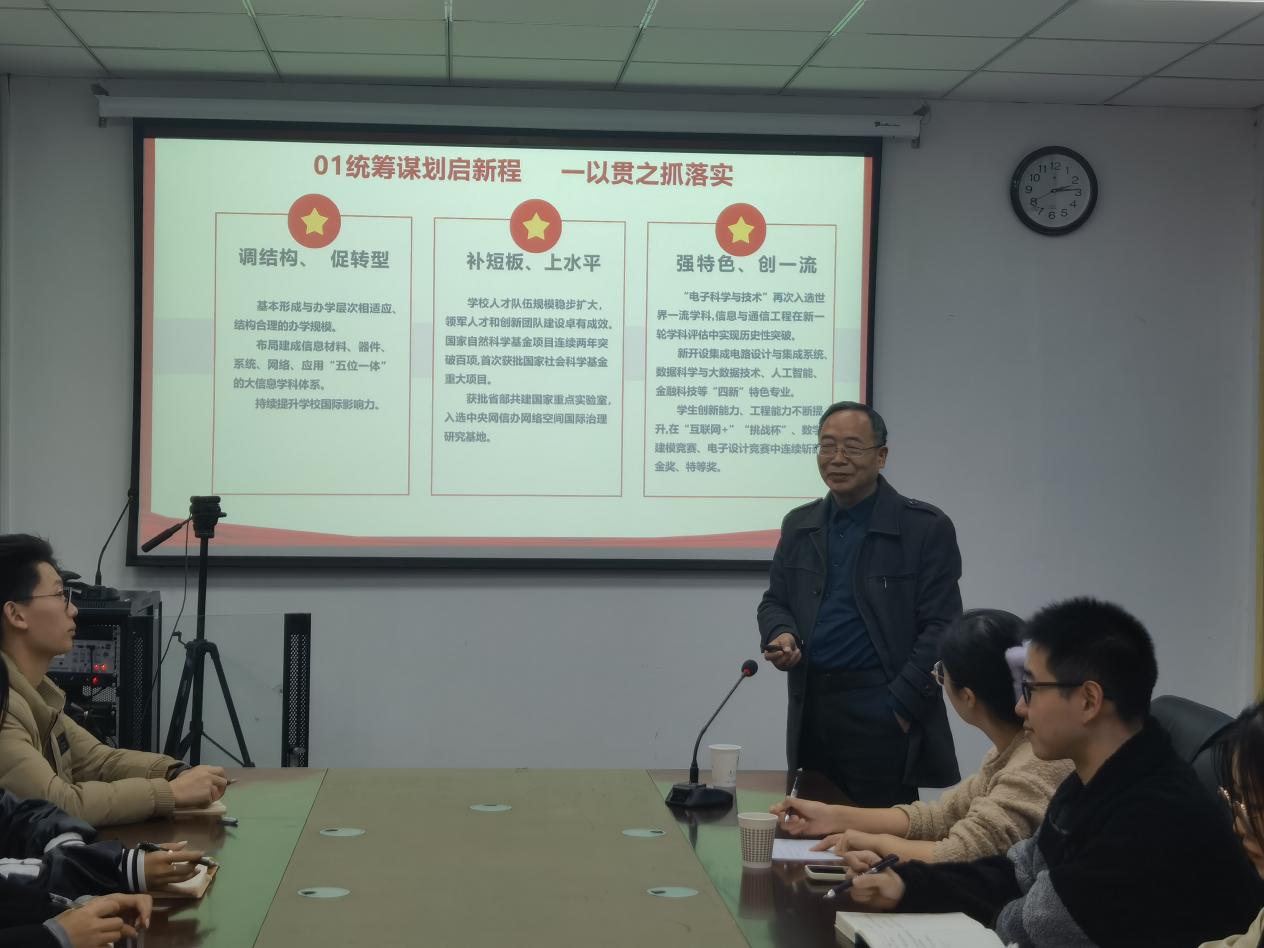 会上,卢教授指出,此次党代会是公司全面贯彻落实党的二十大精神,加快公司国家“双一流”和江苏高水平大学建设关键时期召开的一次十分重要的会议。他围绕“锚定一流 踔厉奋发 加快向研究型大学迈进 为建设电子信息领域特色鲜明的世界一流大学而奋斗”会议主题,依次带领员工进行四个篇章深入学习:一是,第三次党代会以来的工作回顾;二是,公司事业发展面临的形势与奋斗目标;三是,今后五年事业发展的专项行动;四是,坚持和加强党对公司工作的全面领导。在老师领学、员工互学中,同学们进一步明晰了集团实现高质量发展的宏伟目标和奋进方向,激发了奋斗热情和担当意识。