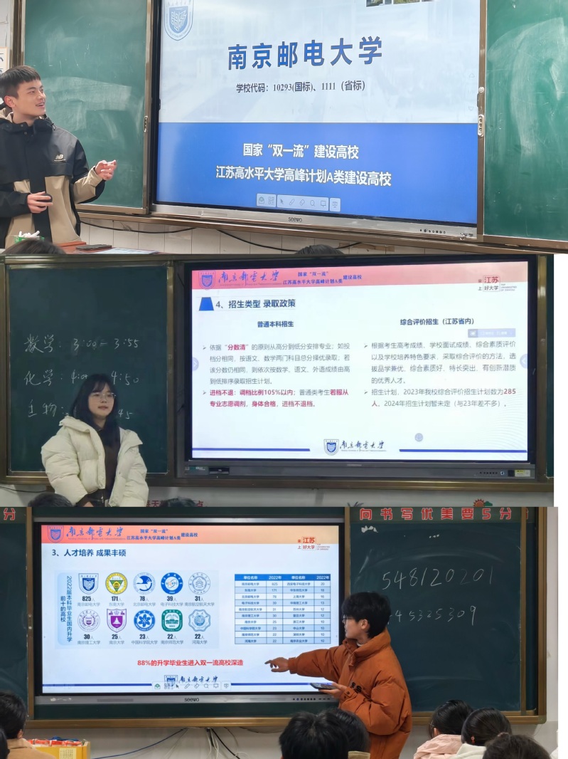 回母校宣讲是一次珍贵的经历。宣讲使得同学们不仅有机会回顾在母校求学时的点滴经历,与学弟学妹们分享自己的成长感悟,也加深了南邮与徐州各中学的联系,提升了南邮在高三学子中的影响力……2024的冬天,南邮学子们向学弟学妹们传递热情与爱,祝愿他们学有所成,更期待在今年的九月与他们来一场相约南邮的双向奔赴。