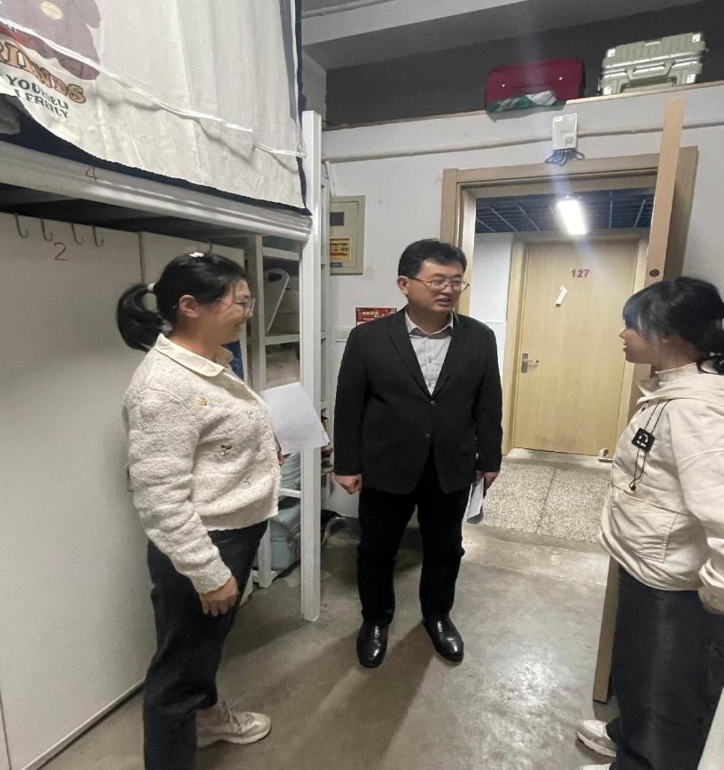 随着天气逐渐转凉,宿舍内违规使用违章电器等安全隐患易发、多发,同时近期呼吸道疾病逐渐增多,干净良好的宿舍环境有利于减轻疾病传播风险,因此检查伊始,郭书记要求全体辅导员要利用此次安全卫生检查为契机,加强员工的安全意识和卫生意识建设,营造良好宿舍环境。在检查走访中,郭书记及辅导员老师同部分宿舍成员进行深入交流,鼓励2025届毕业生抓住考研复习、秋招面试的黄金时期,一鼓作气,祝愿大家顺利到达理想的彼岸,同时详细了解2024级新生及部分老生的学习生活情况,特别寄语2024级新生要珍惜大学时光、踏实学习、勤勉努力,同时要认真做好宿舍卫生工作,为老员工活营造舒适、温馨的住宿环境。